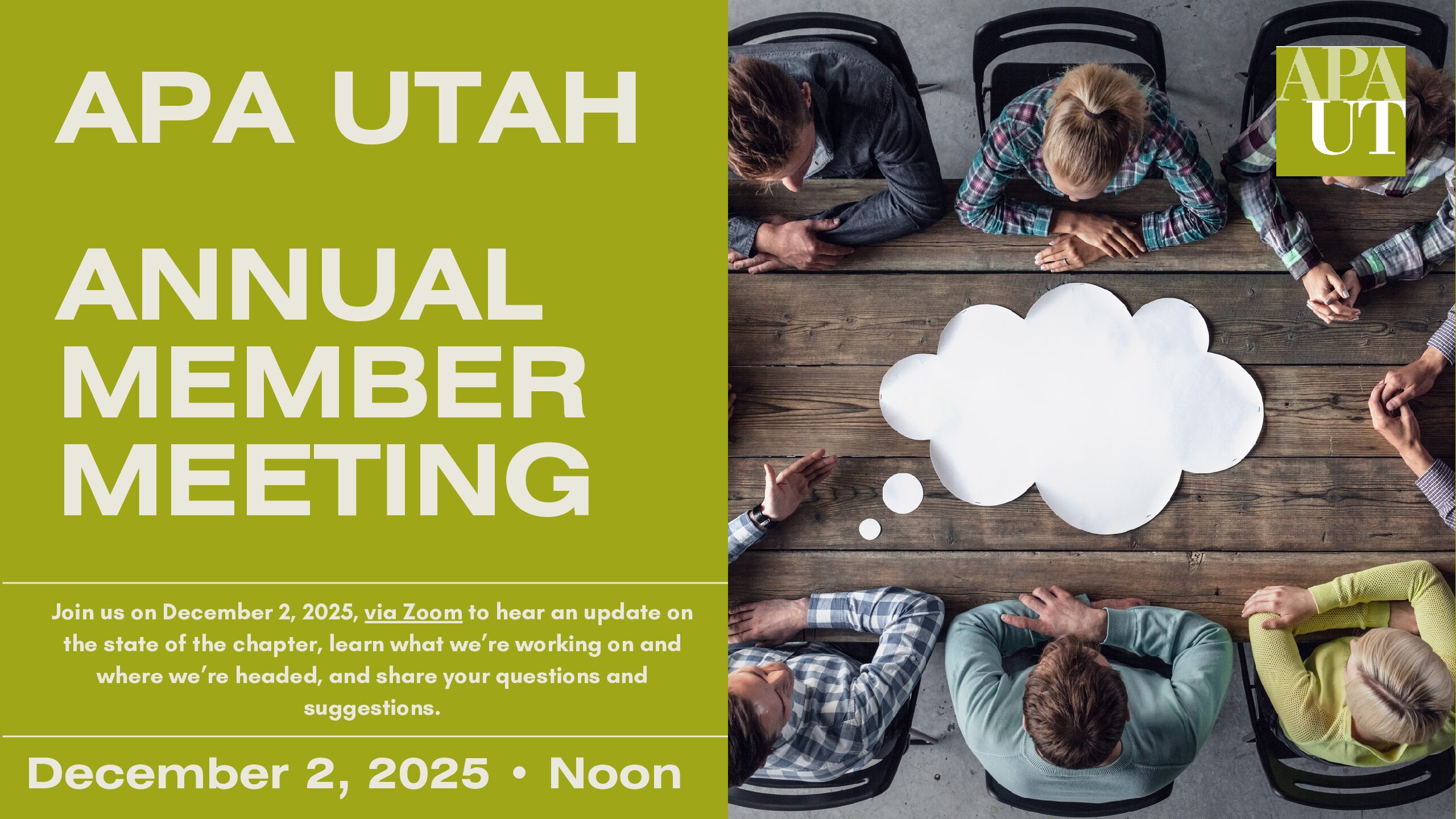 Join us for the APA Utah 2025 Annual Business Meeting, where we’ll review the state of the chapter, highlight accomplishments from the past year, and share what’s ahead for 2026.