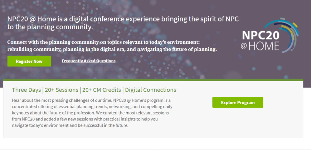 April 29 – May 1, 2020 | #stayhome #NPC20atHome NPC20 @ Home NPC20 @ Home is a digital conference experience bringing the spirit of NPC to the planning community. Connect with the planning community on topics relevant to today’s environment: rebuilding community, planning in the digital era, and navigating the future of planning. Register Now (more…)